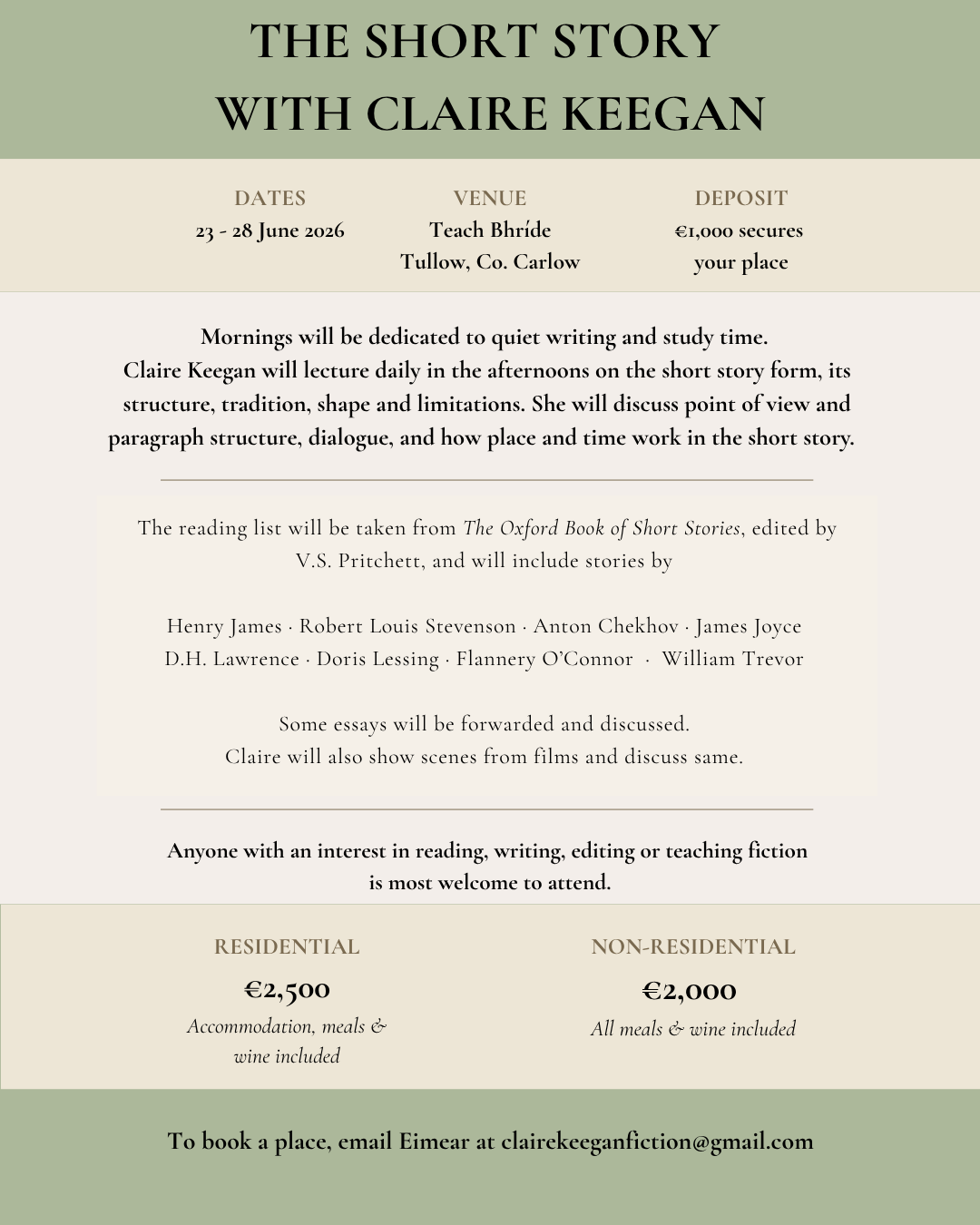 If you’d like to make a reservation on this course, please email Eimear on clairekeeganfiction@gmail.com