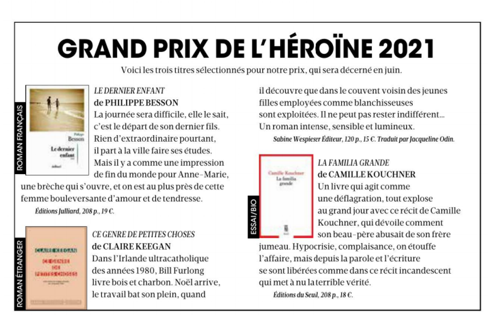 Ce Genre de Petites Choses, the French version of Claire’s new book Small Things like These, has been shortlisted for Le Grand Prix de l’Héroïne – Madame Figaro.